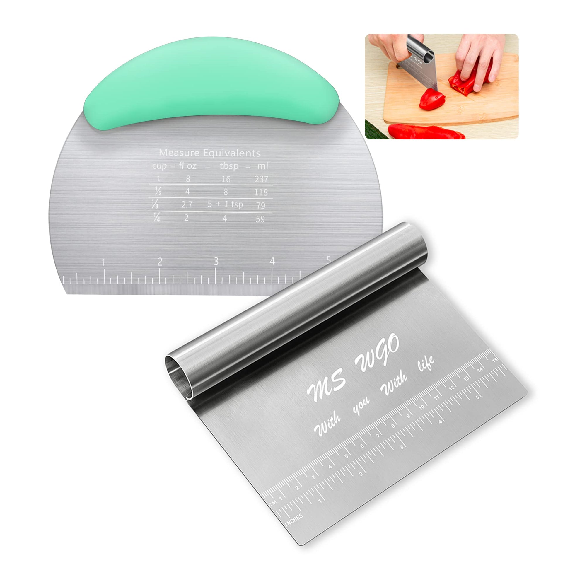 MS WGO Bench Scraper Dough Pastry Pizza Cutter Dough Scraper Tool Kitchen Food Scraper Stainless Steel with Handle for Butter Cookie Dough Vegetable BLUE GREEN