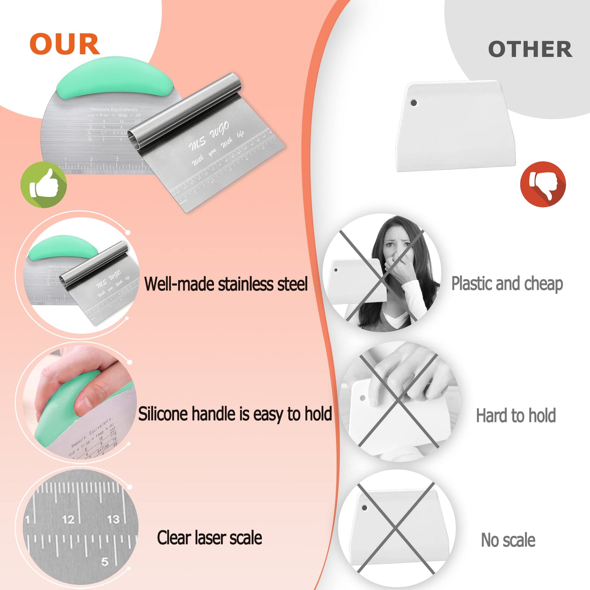 - Enjoy every kind of delicious food easily - The dough cutter uses advanced laser carving technology, so don't worry about the measured value of the paste cutter will wear over time like the printed image. The bench scraper and pizza cutter is very strong and can maintain its advantages well. Make it easy to cut and scoop up.