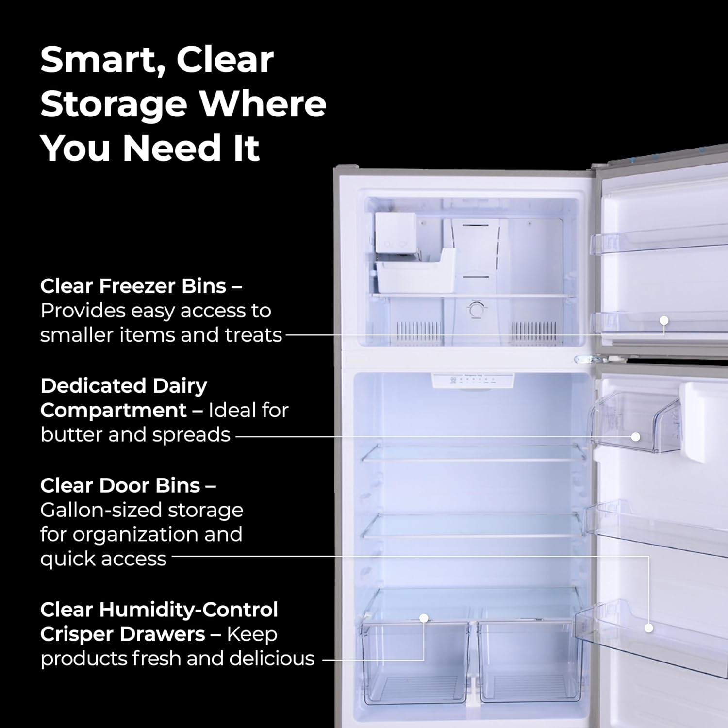 Gallon Door Storage: 3 clear refrigerator door bins hold gallon jugs, condiments, and more. 2 full-width freezer door bins keep smaller frozen items organized